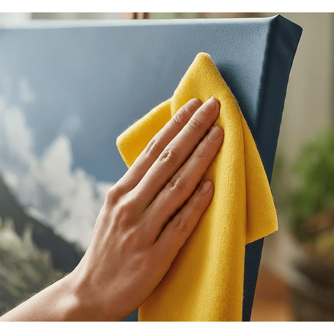 You don’t need to scrub. Simply wipe the canvas gently with your dry microfiber cloth. Start from the top and work your way down in light, horizontal strokes. Do this once a month to keep your art looking fresh.