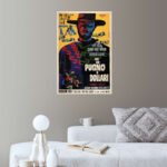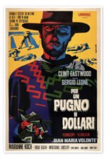 This is where the legend began. This is a faithful reproduction of the original, breathtaking Italian theatrical poster for Sergio Leone’s Per un Pugno di Dollari—the film that created the Spaghetti Western, defined a genre, and made Clint Eastwood a global superstar. It is a masterpiece of 1960s graphic design and a true piece of cinema history.