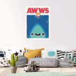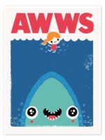 Just when you thought it was safe to go back in the water… for a cuddle! “Awws” is a brilliant and hilarious parody of one of the most terrifying movie posters of all time. This clever artwork takes the iconic image from Jaws and flips it on its head, replacing the menacing great white with an adorable, wide-eyed shark who looks like he just wants to be friends.