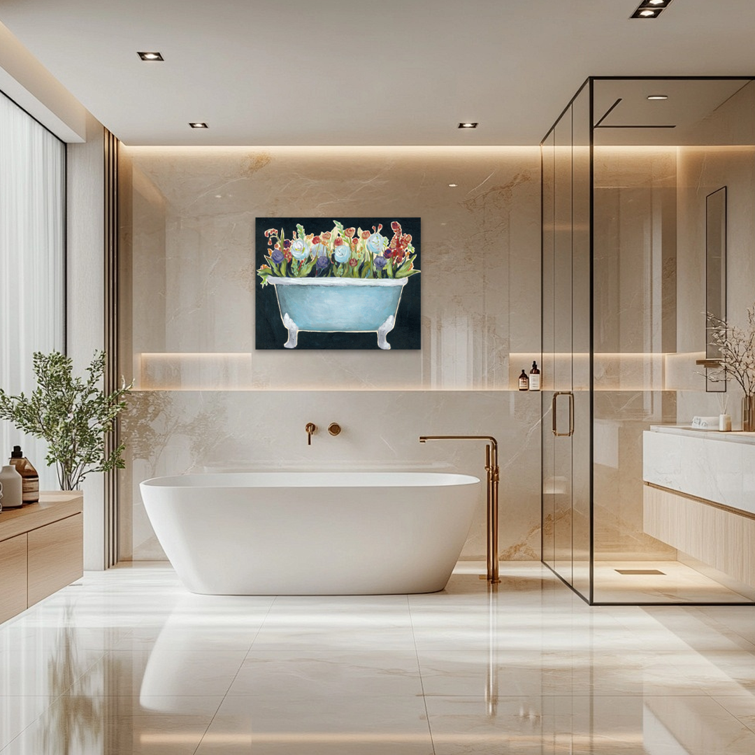 Perfectly suited for adding personality to your bathroom, powder room, or even a laundry room, this canvas print is a conversation starter. Its unique subject matter and rich colors make it an ideal focal point in farmhouse, cottage-core, or eclectic decor schemes. Let “Bathtub Bouquet” infuse your space with a daily dose of cheer and imaginative flair.