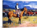 Feel the charged atmosphere of the open range in this masterful Western scene. “Before the Storm” captures a quiet, powerful moment in the life of a cowboy. Bathed in the last rays of sunlight, he sits tall on his trusted horse, a calm and steady presence watching over his herd as a dramatic storm rolls in across the distant mesas. This painting is a narrative of resilience, duty, and the profound beauty of the American frontier.