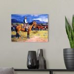 The artist’s skill is showcased in the brilliant use of color and light. The rich, saturated hues bring the scene to life—from the golden coat of the horse to the deep, dramatic blues of the approaching storm clouds. Every detail is rendered with a painterly realism, from the worn leather of the cowboy’s chaps to the delicate wildflowers dotting the prairie, creating a world you can almost step into.