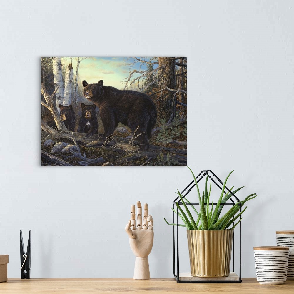 In the quiet hush of the deep woods, a family moment unfolds. “Birchwood Watch” is a breathtakingly intimate portrait of maternal love in the wild, capturing a watchful mother bear as she stands guard over her curious young cubs. This artwork is a window into a secret world, a tribute to the powerful bonds of family and the serene, untamed beauty of the forest.