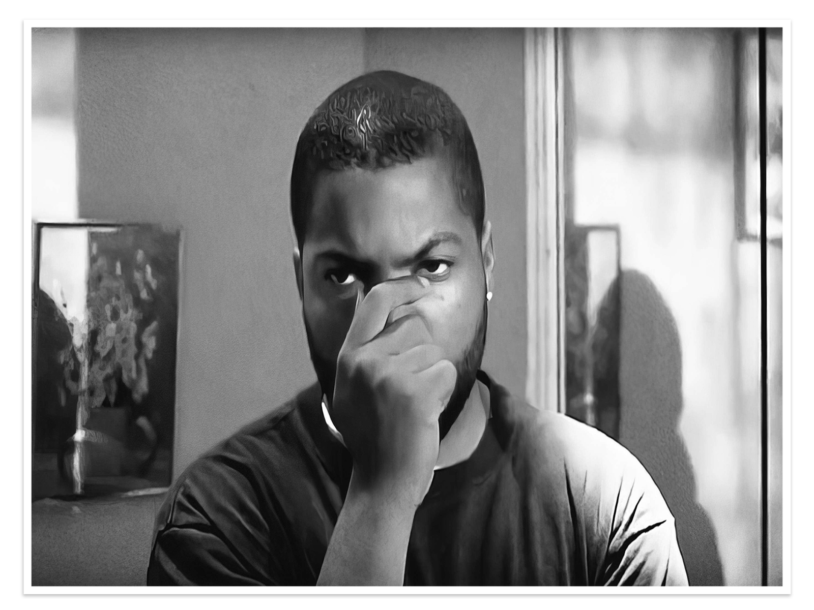 This is more than just a film still; it’s a cultural phenomenon. Rendered in a surprisingly moody and artistic black and white, this image elevates a classic comedy moment to the level of high art. The tight, intense close-up focuses all the attention on Craig’s powerful, fed-up expression, creating a piece that is both instantly recognizable and surprisingly sophisticated.