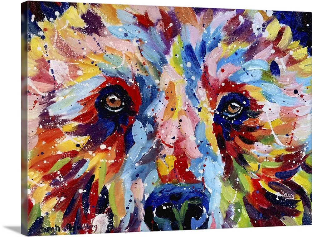 The artist uses a dynamic, expressionistic style, with bold, sweeping brushstrokes that give the piece incredible energy and movement. A rainbow palette of reds, yellows, blues, and pinks defines the bear’s form, layered with playful splatters of white and dark paint that add texture and a sense of spontaneous creation. This is a work of pure feeling, designed to uplift and inspire with its fearless use of color.