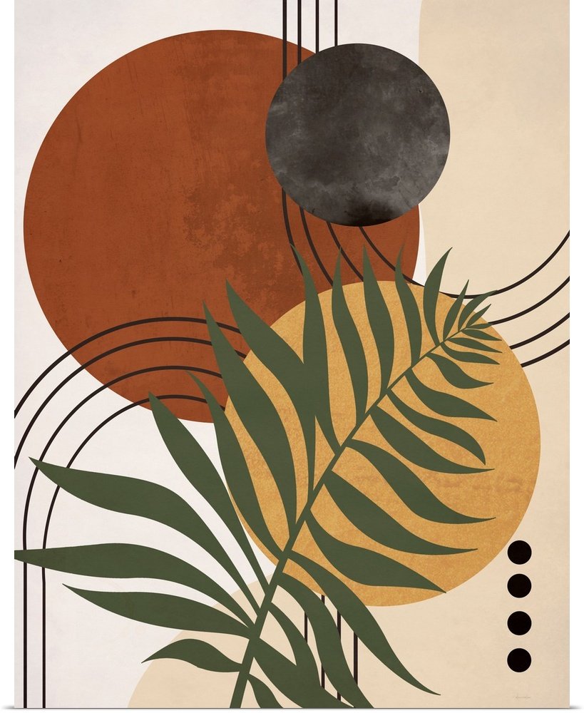 The artist employs a sophisticated, earthy color palette to tie the composition together. Rich terracotta and mustard gold circles provide a warm backdrop, while deep charcoal lines add architectural structure. The sweeping sage green leaf layers over the top, connecting the shapes and adding a breath of botanical life. The result is a visually satisfying collage that feels both retro and current.