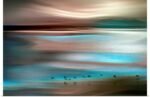 The artist uses motion blur to soften the landscape into beautiful bands of color—rich teal waters merging with the warm, earthy tones of the wet sand and the soft light of the sky. Amidst this dreamlike haze, a flock of shorebirds is captured in silhouette, adding a touch of life and movement that grounds the abstraction in the natural world.