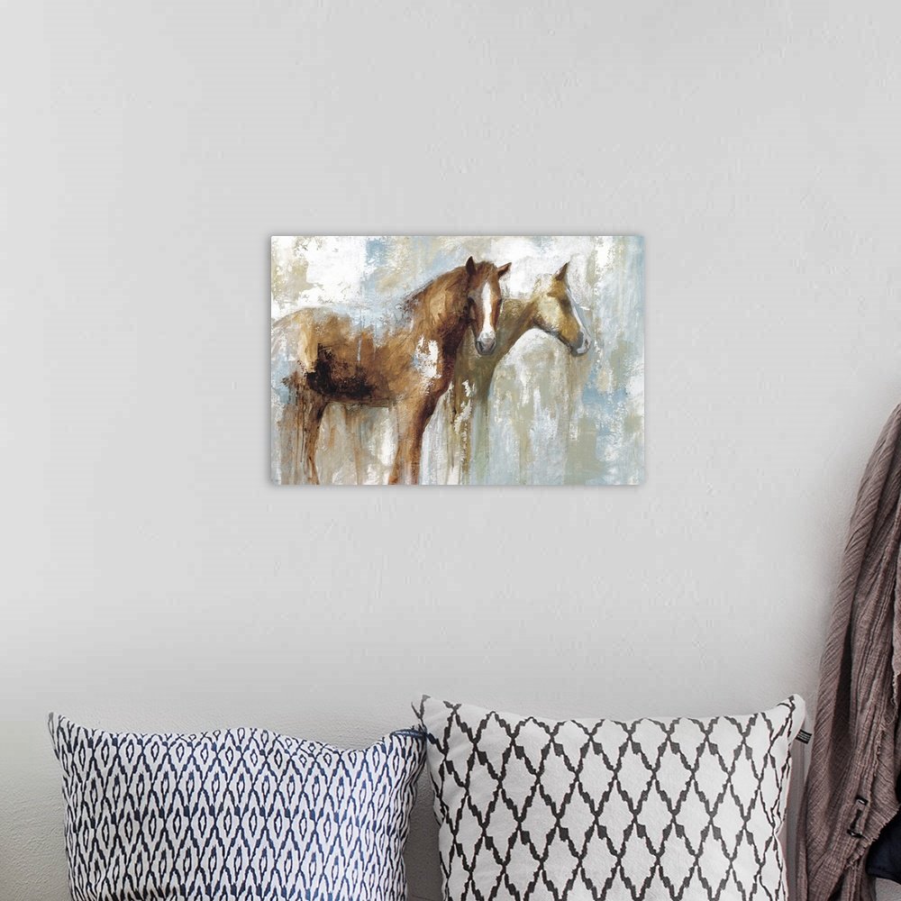 The artist’s technique is a masterful exploration of texture and layering. Thickly applied paint is scraped and blended, creating a distressed, weathered surface that gives the painting a tangible depth. The warm, earthy browns of the horses stand in elegant contrast to the cool, calming blues of the background, creating a perfectly balanced composition that feels both rustic and contemporary.