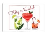 The piece features a trio of beautifully illustrated cocktails, each given a festive twist with garnishes of holly, pine, and a candy cane stirrer. Above them, the elegant script “Feliz Navidad” offers a warm, international holiday greeting. The clean lines and bright colors give the artwork a fresh, contemporary feel that’s full of personality.