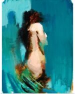 The artist uses a rich, impasto technique to create a surface full of movement and texture. The warm, organic tones of the figure provide a stunning counterpoint to the cool, saturated expanse of the turquoise and teal background. This dramatic interplay of color and form gives the artwork a mood that is both intimate and boldly contemporary.