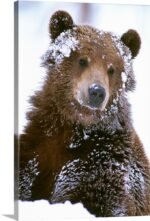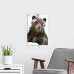 This piece is a stunning example of wildlife photography, where timing and connection create a memorable image. The high-resolution detail is breathtaking, allowing you to see each individual snowflake resting on the bear’s thick, warm fur. The beautiful contrast between the cool white snow and the rich brown coat, combined with the subject’s soulful eyes, makes this a truly captivating work of art.