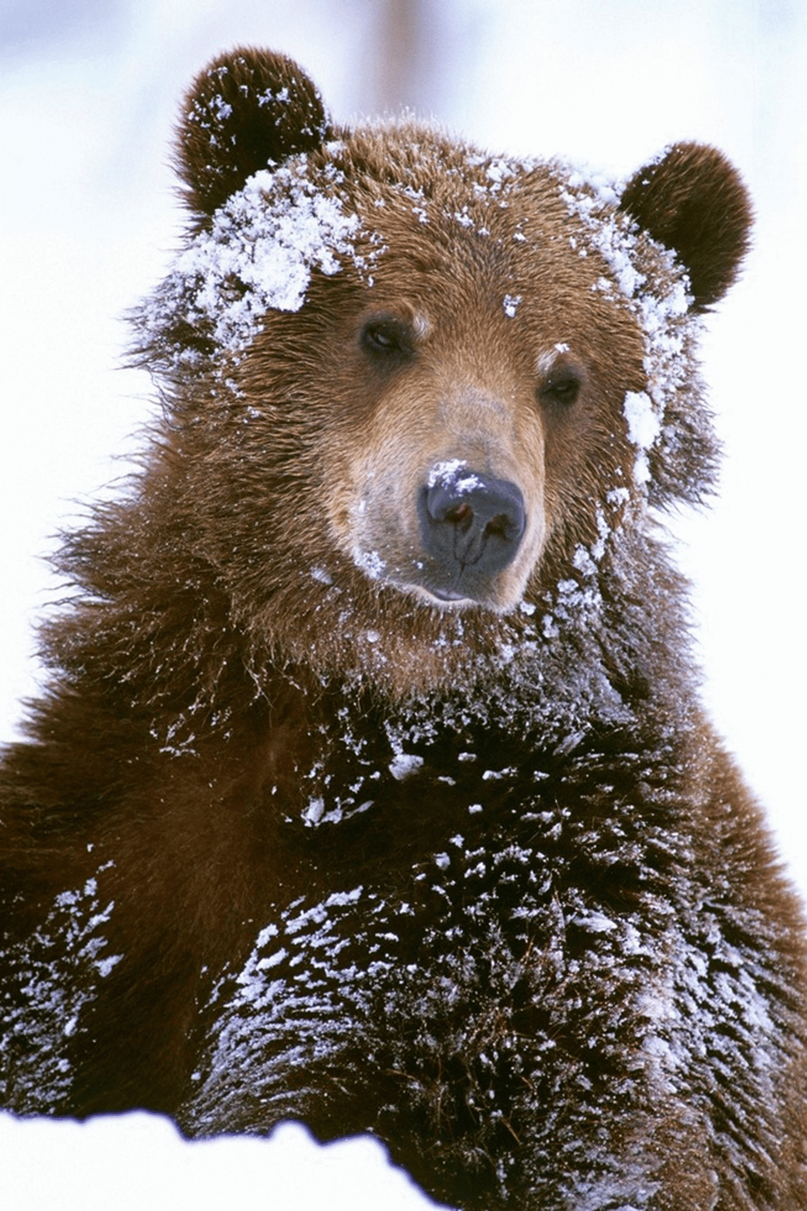 This piece is a stunning example of wildlife photography, where timing and connection create a memorable image. The high-resolution detail is breathtaking, allowing you to see each individual snowflake resting on the bear’s thick, warm fur. The beautiful contrast between the cool white snow and the rich brown coat, combined with the subject’s soulful eyes, makes this a truly captivating work of art.