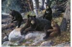In the quiet depths of a sun-dappled forest, a moment of peaceful family life unfolds. “Forest Family” is a touching tribute to the powerful bonds of nature, capturing a watchful mother bear as she presides over her playful cubs by a gentle stream. This artwork is a window into a secret, serene world, celebrating the themes of maternal love, safety, and the simple joys of a day in the wild.