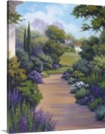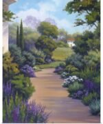 Step into a hidden world of peace and fragrance. “Garden Sanctuary” is a beautiful invitation to take a slow stroll down a sun-dappled path in the countryside. This artwork captures the essence of a perfect afternoon, where the scent of blooming lavender fills the air and a winding trail leads you toward the promise of a warm, welcoming home nestled among the trees.