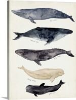 This piece is brought to life through a delicate watercolor style. Each of the five whales—from the immense Blue Whale to the distinct Humpback—is painted with soft washes of blues and greys that capture their unique forms and textures. The addition of handwritten labels gives the print the intimate, personal feel of a page torn from a vintage naturalist’s sketchbook.