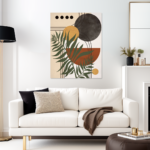 Bring a sense of balanced warmth and artistic structure to your home with this captivating design. “Geometric Harmony” creates a beautiful dialogue between the natural world and modern design, merging the organic curves of a fern frond with the clean precision of mid-century geometry. It is an artwork that feels grounded, stylish, and full of character.