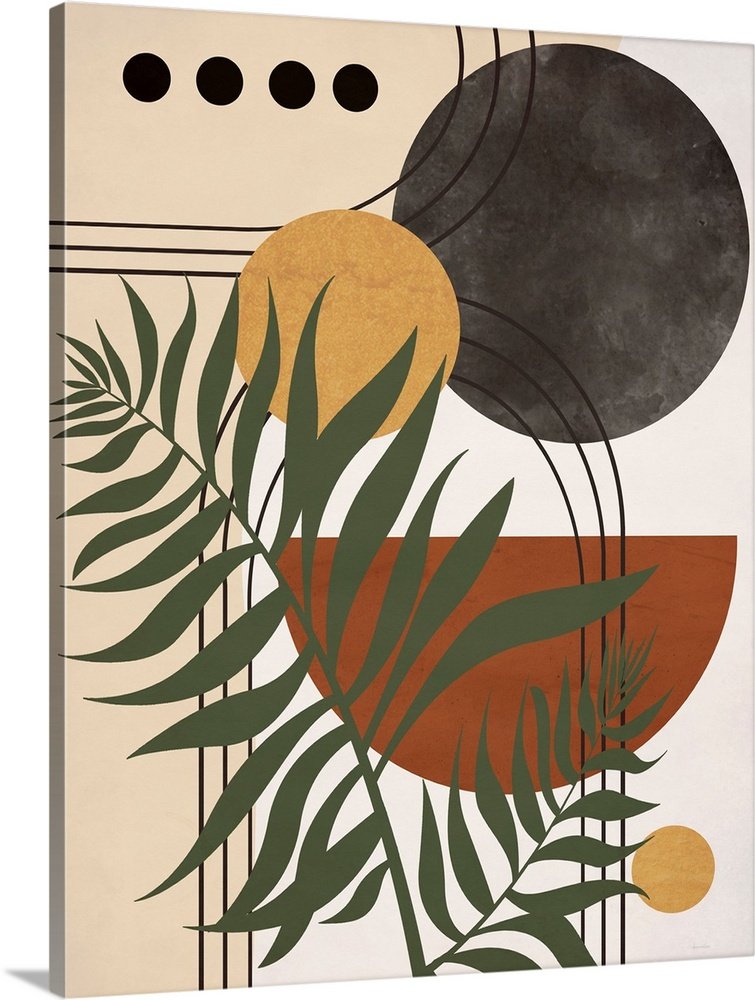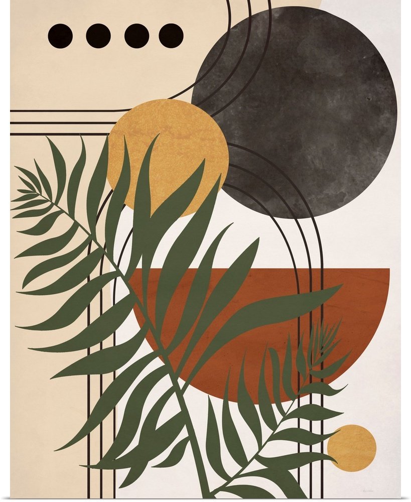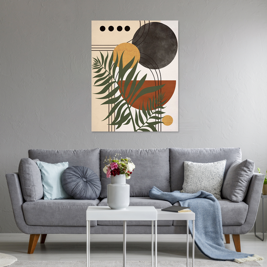 Bring a sense of balanced warmth and artistic structure to your home with this captivating design. “Geometric Harmony” creates a beautiful dialogue between the natural world and modern design, merging the organic curves of a fern frond with the clean precision of mid-century geometry. It is an artwork that feels grounded, stylish, and full of character.