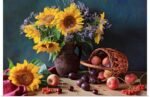 Step into a scene of rustic elegance and bountiful charm. “Golden Abundance” is a heartfelt tribute to the timeless beauty of the harvest, evoking the richness and warmth of a classic European still life. This artwork captures a moment of overflowing generosity, where radiant sunflowers and ripe, succulent fruits come together in a symphony of color and texture, celebrating the simple, beautiful gifts of the earth.