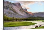 As the day comes to a tranquil close, the last rays of sun kiss the mountain peaks in a final, golden farewell. “Golden Hour Grazing” is a breathtaking window into this moment of profound peace in the untamed wilderness. This artwork transports you to a serene river valley where bison roam freely, inviting you to share in the quiet majesty of a world untouched by time.
