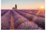 This piece is a masterpiece of landscape photography, where light is the true subject. The artist has masterfully captured the “golden hour,” with the sun creating a radiant starburst on the horizon, its rays fanning out to kiss the lavender blossoms and make them glow from within. The perfect, receding rows of lavender create powerful leading lines, drawing you into this idyllic, dreamlike scene.