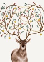 The artist uses soft watercolor washes to create a look that is both nostalgic and fresh. The deer’s warm, brown eyes seem to sparkle with holiday secrets, while the delicate details of the decorations stand out beautifully against the clean, white background. It is a playful and artistic take on traditional holiday decor that feels personal and heartwarming.
