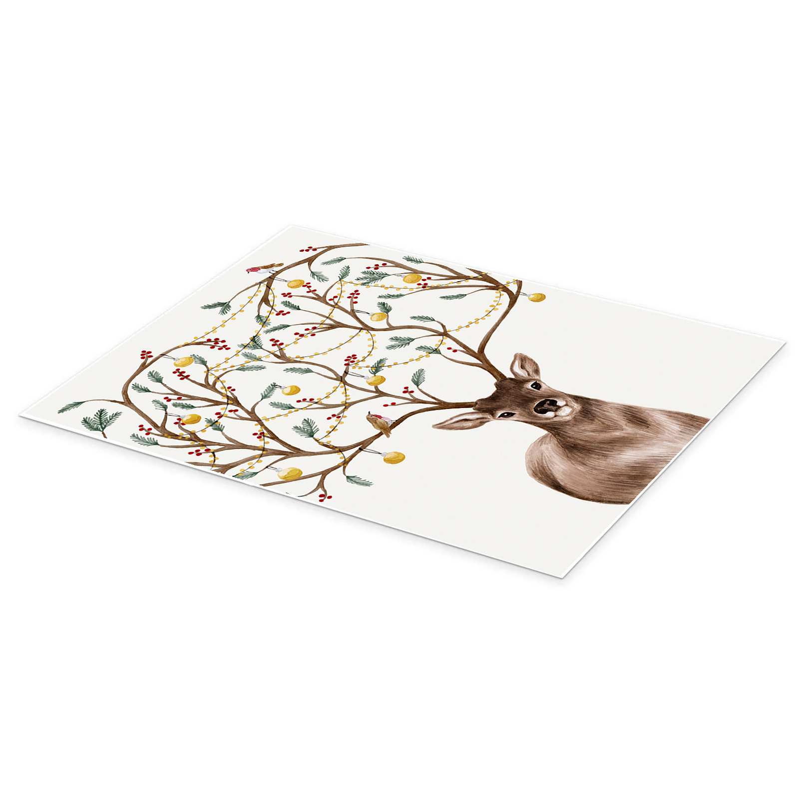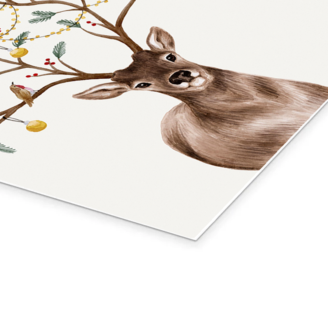 The artist uses soft watercolor washes to create a look that is both nostalgic and fresh. The deer’s warm, brown eyes seem to sparkle with holiday secrets, while the delicate details of the decorations stand out beautifully against the clean, white background. It is a playful and artistic take on traditional holiday decor that feels personal and heartwarming.