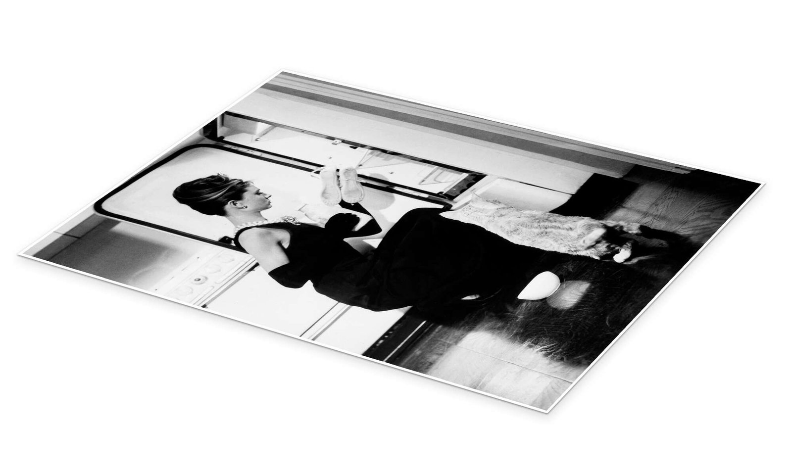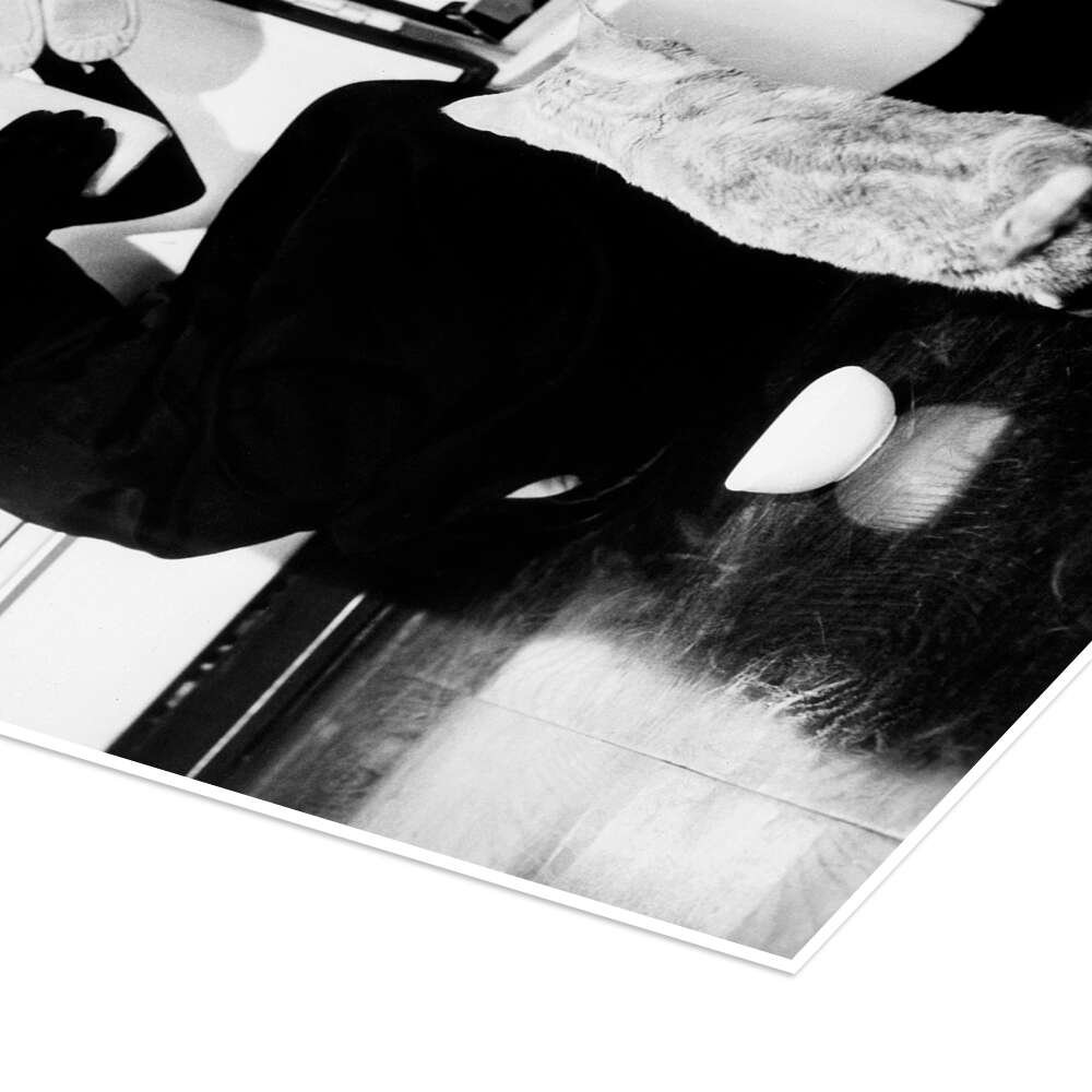 The print is a study in classic monochromatic style. The sharp black and white photography highlights the delicate features of Audrey Hepburn and the texture of the scene, from the sleek refrigerator to the scruffy fur of the cat. It serves as a window into Holly’s eccentric world, where shoes are stored in the fridge and life is a constant search for a place where you and things belong.