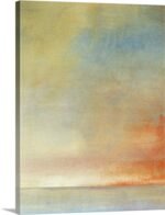 The artistry of this piece lies in its subtlety and texture. The artist uses soft, blended washes of warm ochre, gentle peach, and hazy blue to create a luminous, atmospheric sky. The fine, visible weave of the canvas becomes part of the artwork itself, adding a tactile dimension to the visual experience. The clean, simple horizon line anchors the composition, providing a sense of stability and infinite calm.