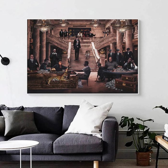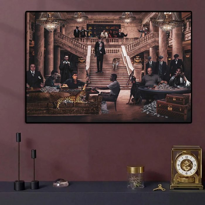 This is the ultimate, unforgettable statement piece for the true fan of gangster cinema. “House of Hustlers” is designed to be the commanding centerpiece of a man cave, home theater, bar, or modern office. It’s an instant conversation starter and a powerful, stylish tribute to the characters who built their own empires.