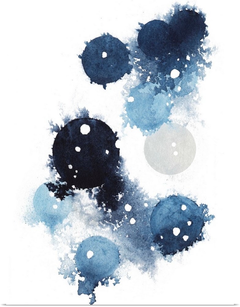 The artist masterfully manipulates the watercolor medium to create a sense of depth and motion. Deeply saturated circles of navy blue provide a rich anchor, while their edges bleed and soften into the paper. Lighter, more translucent orbs overlap and interact, creating a beautiful layered effect. The small white dots, preserved from the paper itself, add a final, delicate touch, like tiny bubbles rising to the surface.