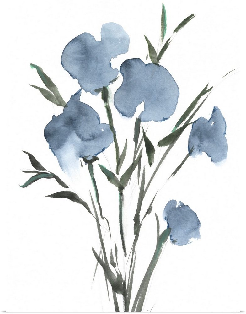The artwork is a beautiful study in minimalism and fluidity. Translucent washes of slate blue and indigo bleed gently into the paper, creating organic floral shapes that feel light and airy. The slender green stems anchor the composition without weighing it down, while the ample white space creates a clean, open feeling that is essential for a relaxing atmosphere.