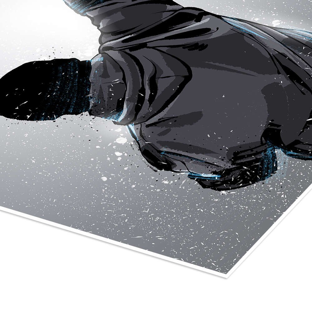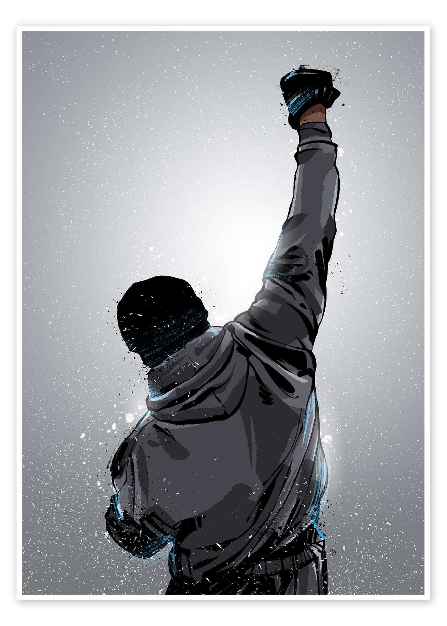 A stunning example of modern minimalist illustration, this artwork strips the icon down to his most powerful symbol: the triumphant, raised fist. The choice to show him from behind makes the image universal, a symbol for anyone facing their own personal fight. The cool, monochromatic palette and energetic splatter effect create a piece that is both sophisticated and full of raw, inspirational power.