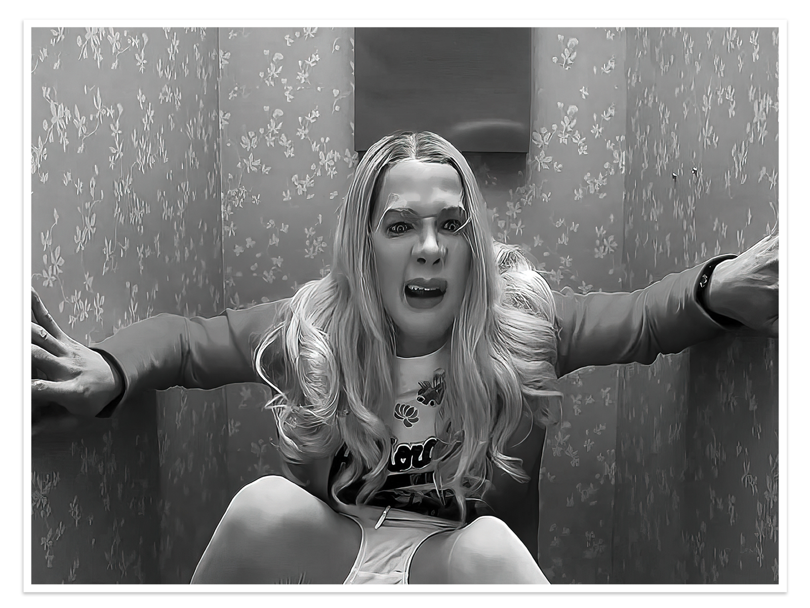 This is more than just a film still; it’s a badge of honor for anyone with a bold sense of humor. Rendered in a surprisingly artistic black and white, the image elevates a moment of pure chaos to the level of high art. The composition perfectly captures the raw, desperate energy of the scene, creating a piece that is both iconic and hilariously unforgettable.