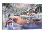 The painting is filled with delightful details that reward a closer look. From the snowman ready for a day of skiing and the red cardinal perched on his stick arm, to the gentle deer and geese by the frozen water, every element tells a story. Across the lake, a cozy log cabin beckons with warm light and a crackling fire pit, offering the ultimate winter retreat. The interplay of cool blue shadows and the warm glow of the sunrise creates a breathtaking atmosphere.
