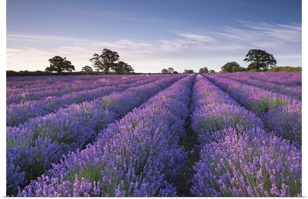 This is a masterwork of landscape photography, perfectly capturing the gentle light of early morning or late evening. The high-resolution detail is so crisp you can almost count the individual blossoms, while the strong, leading lines of the lavender rows create a hypnotic sense of depth and perspective. The beautiful contrast between the vibrant purple field and the soft blue sky is simply breathtaking.
