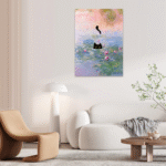 This piece is a delightful study in contrasts. The background is a loving homage to Monet, with soft, impressionistic strokes capturing the serene beauty of the water lilies and their reflections in a palette of gentle pinks, blues, and greens. Swimming through this tranquil scene is a bold, simple, cartoonish black cat, whose wide, innocent eyes add a touch of hilarious surrealism.