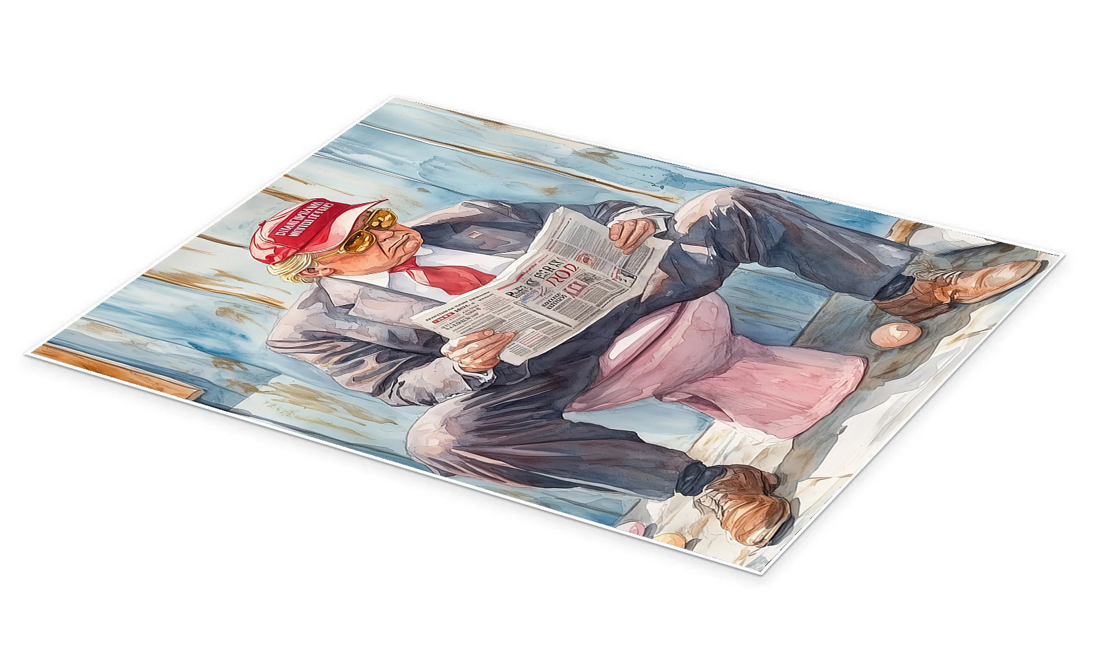 The artist’s expressive watercolor style brings a surprising level of fine art flair to this humorous scene. The loose, confident washes of color in the background contrast beautifully with the detailed rendering of the famous figure, from his signature red cap to the headlines on the newspaper he’s perusing. It’s a high-quality piece of art that just happens to be brilliantly funny.