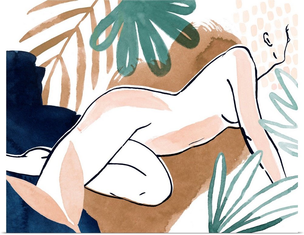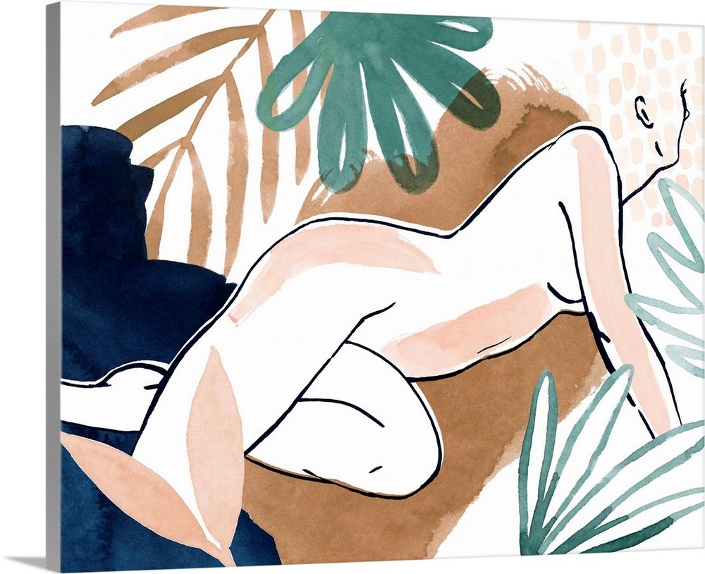 The artwork features a graceful, minimalist line drawing of a reclining figure, capturing a sense of ease and rest. This fluid form is layered over abstract shapes of tropical leaves and organic color blocks in rich shades of terracotta, sage green, and deep navy. The combination of clean lines and earthy colors creates a look that is both modern and wonderfully warm.