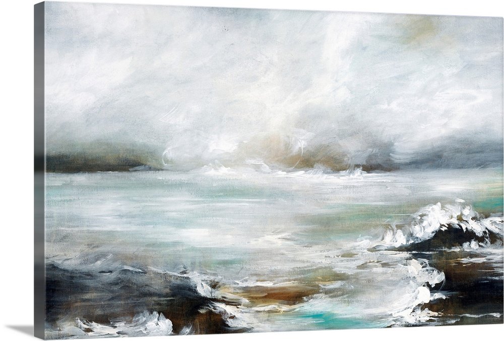 The artist’s masterful, expressive technique is central to the piece’s emotional impact. Energetic, gestural brushstrokes create the churning motion of the foreground waves, while soft, blended layers of paint form the misty, light-filled sky. The sophisticated, muted palette of greys, taupes, and soft sea greens is both calming and intensely dramatic, making it a work of captivating subtlety.