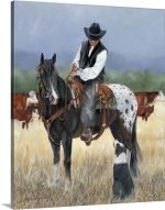 This artwork is a tribute to the unspoken bond and tireless teamwork at the heart of the American West. “Partners on the Prairie” captures a serene, unguarded moment in a cowboy’s day. Paused amidst the golden grasses, he sits astride his magnificent Appaloosa, while his loyal dog looks up, ever-ready for the next command. It’s a powerful and authentic portrait of the three working partners who manage the herd.