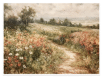 Take a gentle stroll down a sun-dappled country path and let your worries melt away. “Pastoral Pathway” is a beautiful, nostalgic escape to a simpler time and place. This artwork captures the quiet charm of the countryside, where a winding path invites you through a meadow of blooming wildflowers towards the peaceful promise of a village on the horizon. It’s a piece that speaks of home, tranquility, and the gentle beauty of nature.