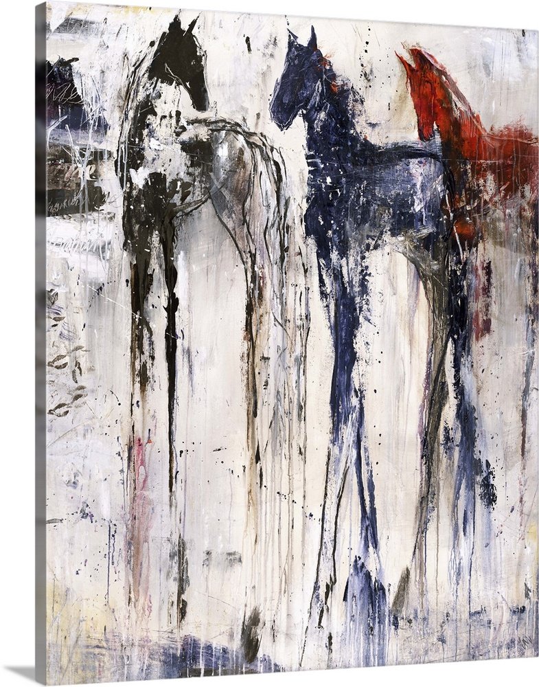 Unleash a wave of raw, untamed energy onto your walls. “Phantom Herd” is not a placid portrait but a primal expression of movement and spirit. This artwork captures the ghost-like essence of three horses, their forms deconstructed into a beautiful chaos of lines, drips, and color. It’s a piece that speaks to the wild, untethered soul within the noble equine form.