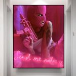 This piece is a masterclass in contemporary pop art, drenched in the electric glow of neon pink and purple. The artist uses a striking composition to create a portrait that is both alluring and confrontational. The anonymity of the ski mask is contrasted with the directness of the gaze, while the cheeky neon sign in the foreground adds a layer of playful, modern audacity to the entire scene.