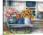 Step onto a sun-drenched country porch and breathe in the sweet scent of fresh-cut flowers. “Porch Petals” is a heartwarming scene that captures the simple, joyful abundance of a summer garden. This artwork is a celebration of rustic charm, featuring an old wooden cart brimming with buckets of vibrant sunflowers and colorful wildflowers, ready to brighten any home.