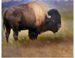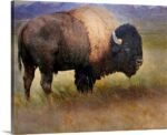 The artist’s painterly style brings this magnificent creature to life with rich texture and a masterful use of light. You can almost feel the coarse, thick fur, with warm light catching the massive shoulder hump, setting it aglow against the hazy, distant mountains. The loose, confident brushstrokes in the grassy foreground add a sense of movement and natural beauty to the serene scene.