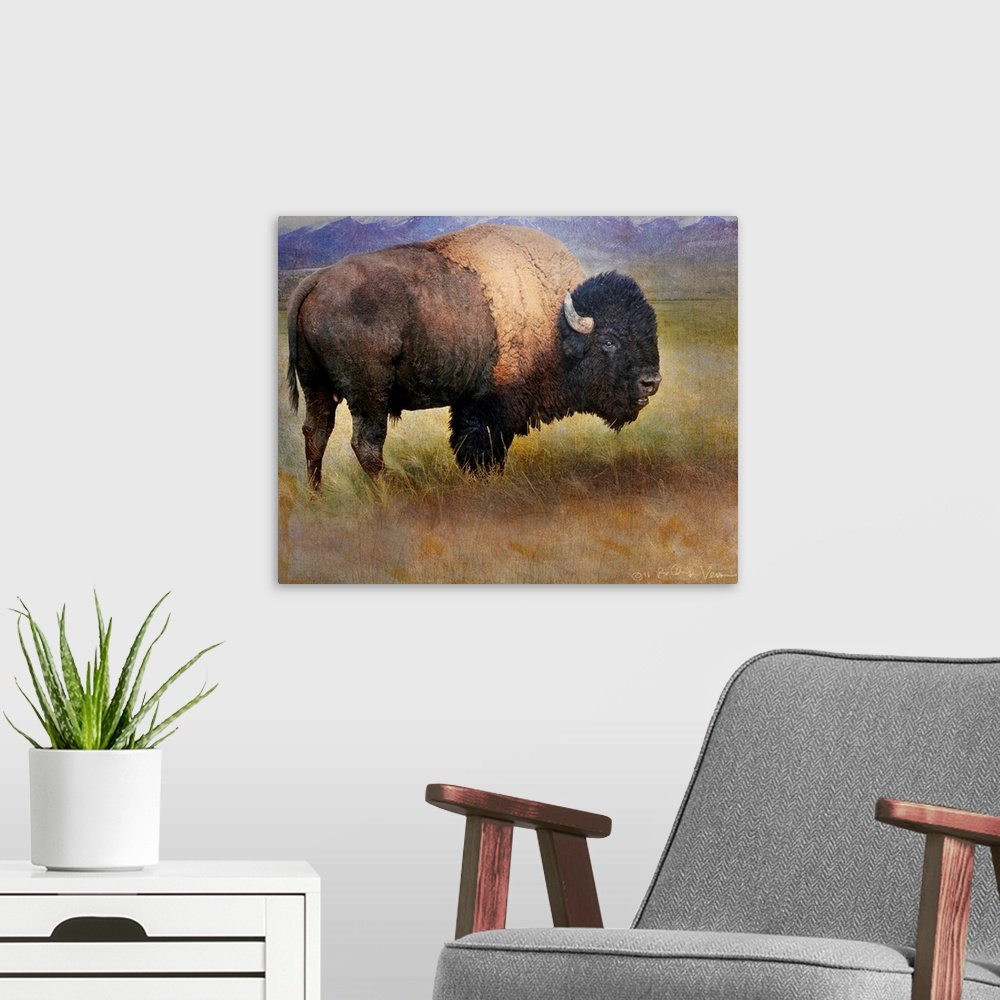 The artist’s painterly style brings this magnificent creature to life with rich texture and a masterful use of light. You can almost feel the coarse, thick fur, with warm light catching the massive shoulder hump, setting it aglow against the hazy, distant mountains. The loose, confident brushstrokes in the grassy foreground add a sense of movement and natural beauty to the serene scene.