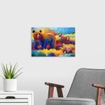The artist utilizes a bold, impressionistic style with a rich impasto technique, where thick layers of paint create a dynamic, touchable texture. A fearless, rainbow-inspired palette defines the bears and their surroundings; warm oranges melt into cool blues on the mother’s back, while the ground beneath them is a mosaic of joyful yellows, reds, and greens. This is a masterful use of color to convey pure emotion.