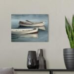 The artist’s soft, impressionistic style gives this piece its gentle, timeless charm. The muted palette of dusty blues and soft greys creates a cool, tranquil atmosphere, while the warm, creamy tones of the wooden boats provide a touch of rustic warmth. The visible texture of the canvas and the painterly brushstrokes add a layer of handmade artistry and sophistication.
