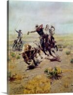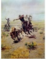 Feel the adrenaline and the dust of the arena with “Roping the Steer.” This high-energy artwork throws you right into the heart of the action, capturing the skill and bravery of the American cowboy. It is a celebration of the rugged spirit of the West, where man and horse work in perfect, powerful unison against the wild elements.