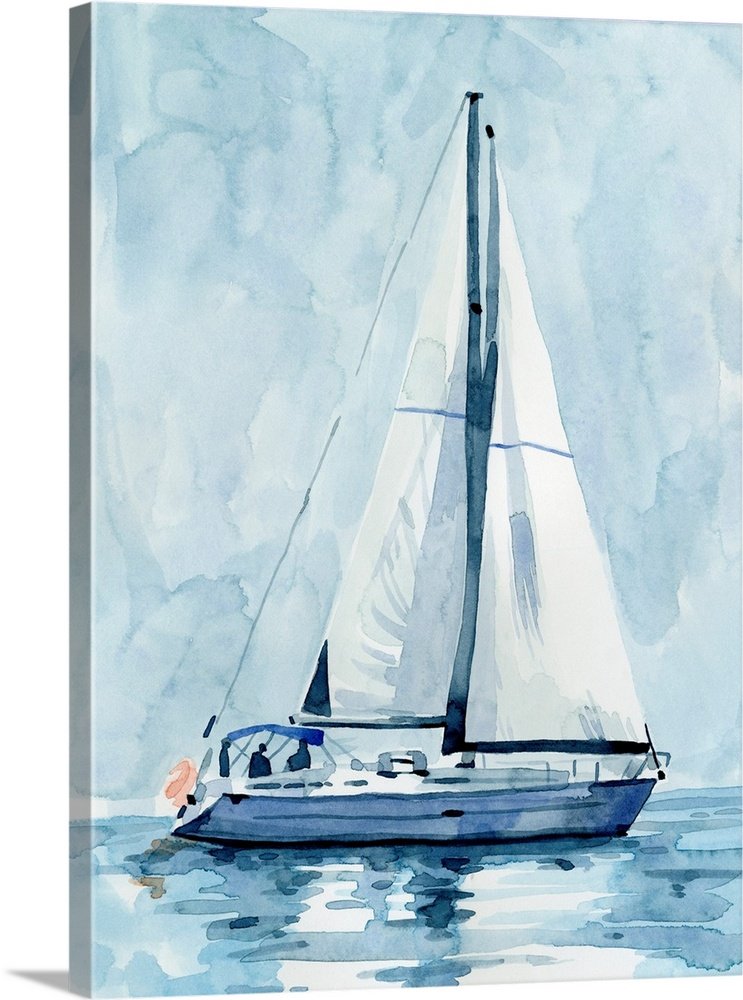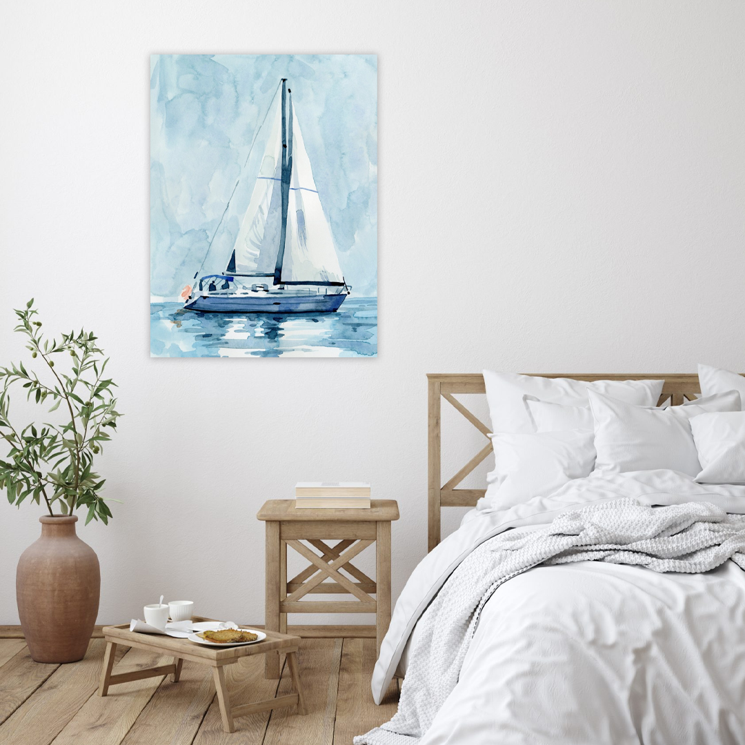 The artist uses the fluid nature of watercolor to perfection, creating a sky and sea that seem to merge in a haze of soft blues. The sails stand crisp and white against the atmospheric background, while the reflection in the water adds a touch of dreamlike depth. The monochromatic palette is incredibly soothing, making it ideal for creating a restful environment.